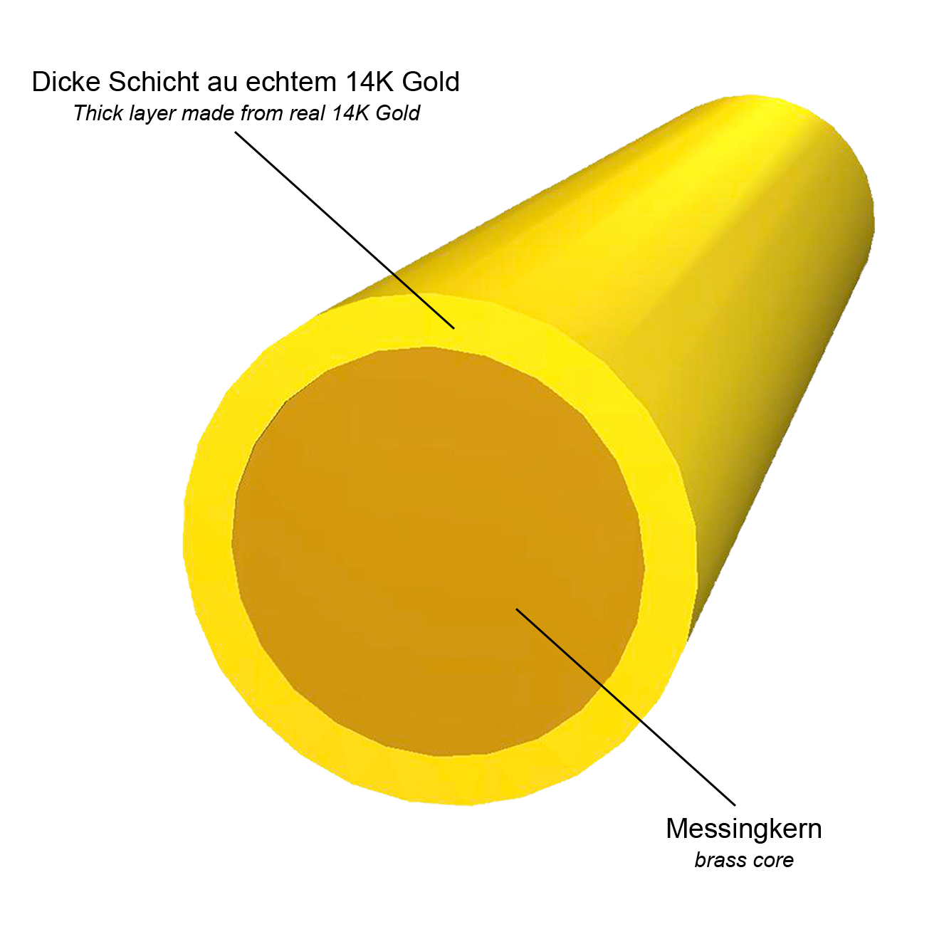 In einem speziellen Verfahren wird eine dicke Goldschicht unter hoher Hitze und mechanischem Druck mit einem Messingkern verbunden. Dadurch bleibt das Gold dauerhaft mit dem Messing verbunden. In Kombination mit dem hohen Goldanteil und der Dicke der Goldschicht wird so eine extrem lange Lebensdauer erreicht.